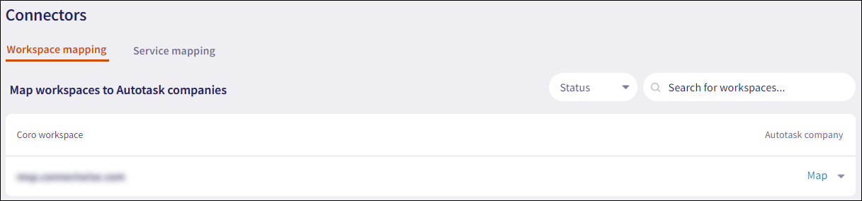 The Workspace mapping column now shows that one Coro workspace is mapped to an Autotask company: