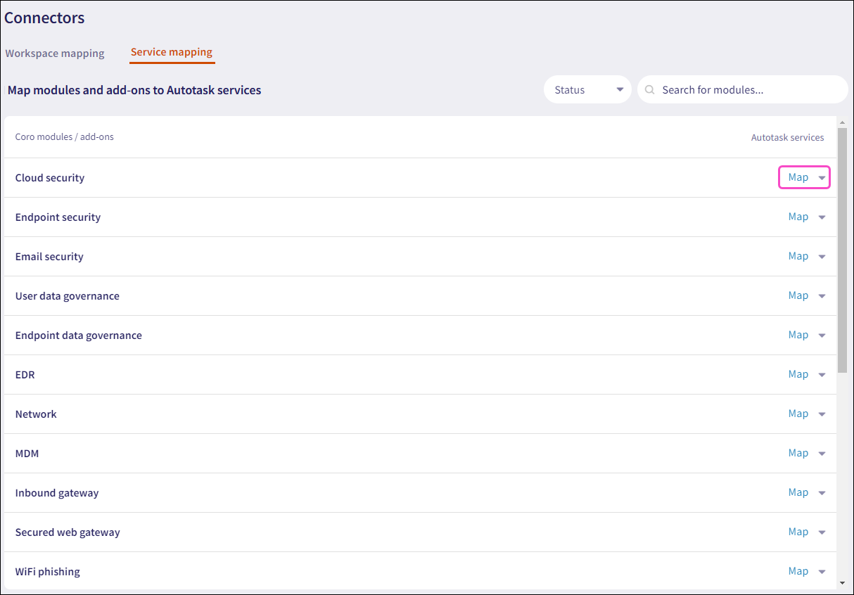 After mapping your workspaces, map Coro services to Autotask services. Service mapping links each Coro module or add-on (such as Endpoint Security or Secure Messages) to a corresponding service in Autotask.