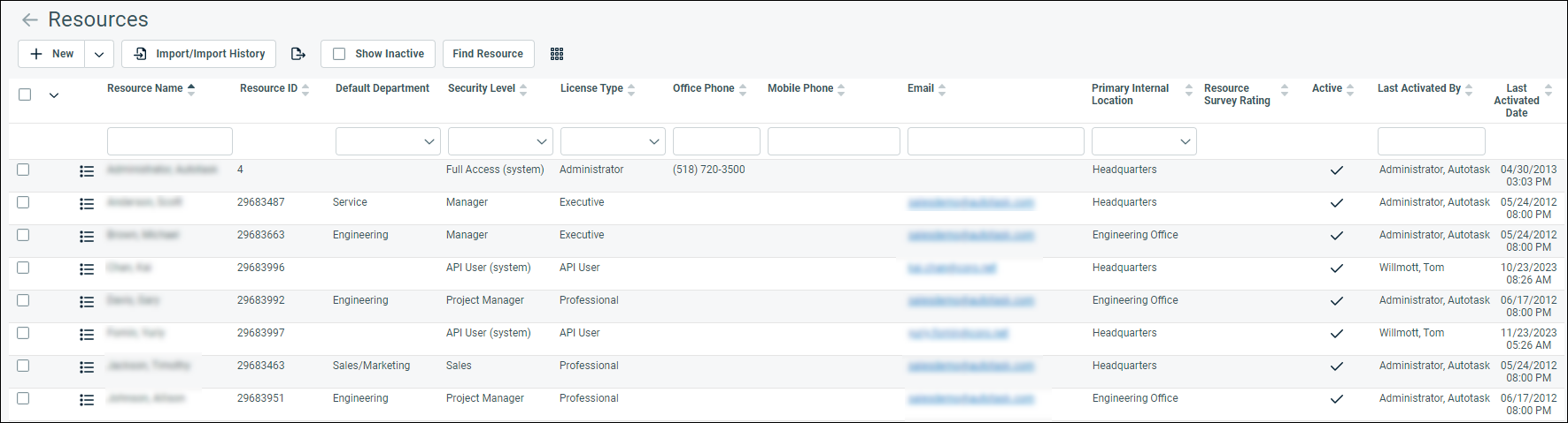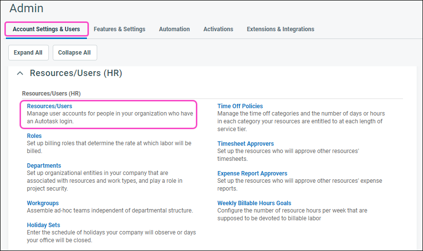 From the Account Settings & Users tab, expand Resources/Users (HR), and then select Resources/Users: