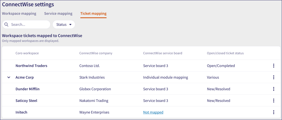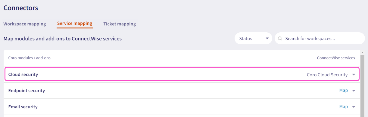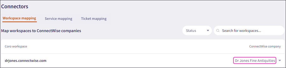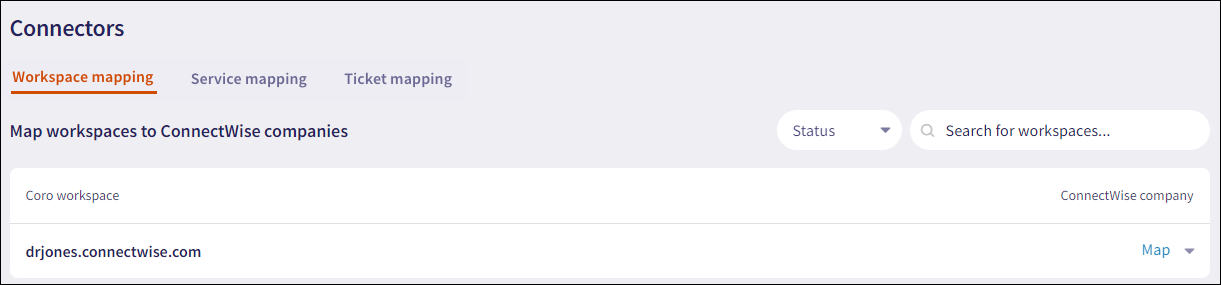 Workspace mapping allows you to link Coro child workspaces to ConnectWise companies. A ConnectWise company represents a Coro child workspace.