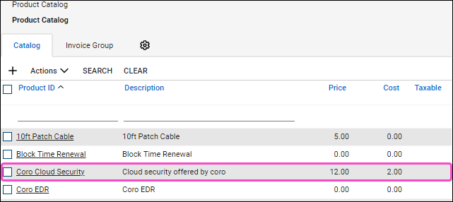 The service selected from the ConnectWise services dropdown in the Coro console corresponds to the product listed on the Product Catalog in ConnectWise Manage:
