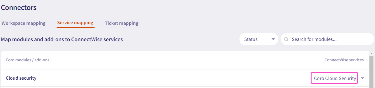 After mapping your workspaces and services, map Coro ticket logs to ConnectWise Service Boards.