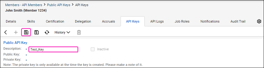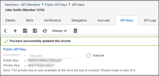 The API member record is updated, and both the public and private keys are generated: