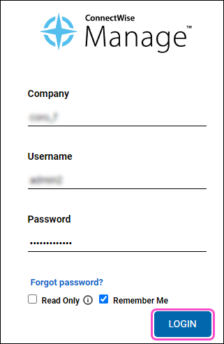 https://example.connectwise.com.Enter the company, username, and password provided by ConnectWise and then select LOGIN
