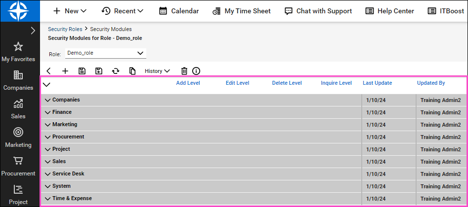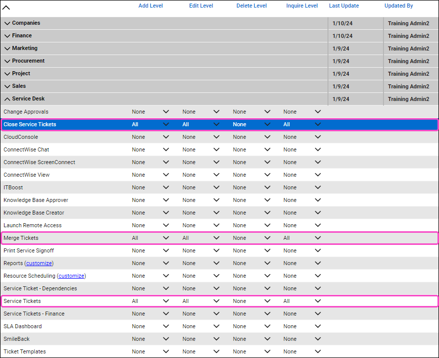 Expand Service Desk and set Add Level, Edit Level, and Inquire Level to All for Close Service Tickets, Merge Tickets, and Service Tickets:
