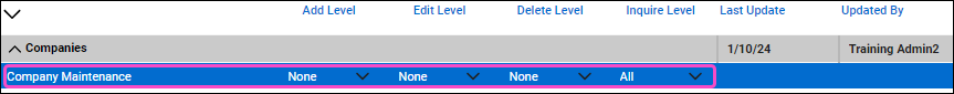 Expand Companies and set Inquire Level to All for Company Maintenance: