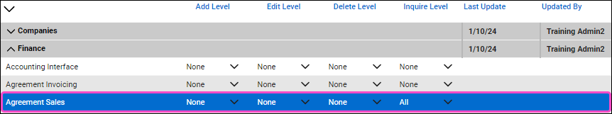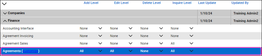 Set Add Level, Edit Level, and Inquire Level to All for Agreements: