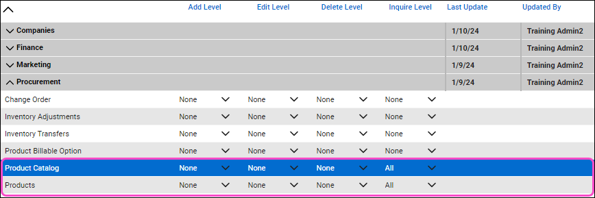 Expand Procurement and set Inquire Level to All for Product Catalog and Products:
