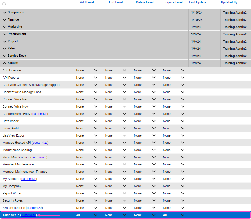 To configure Table Setup, select Customize and verify Company/Company Status, Company/Company Type, Invoicing/Billing Cycle, and Service/Service Board are set to Allow, and then select SAVE: