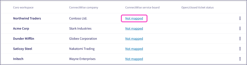 For any mapped workspace, select Not mapped under the ConnectWise service board column to begin mapping your ticket logs: