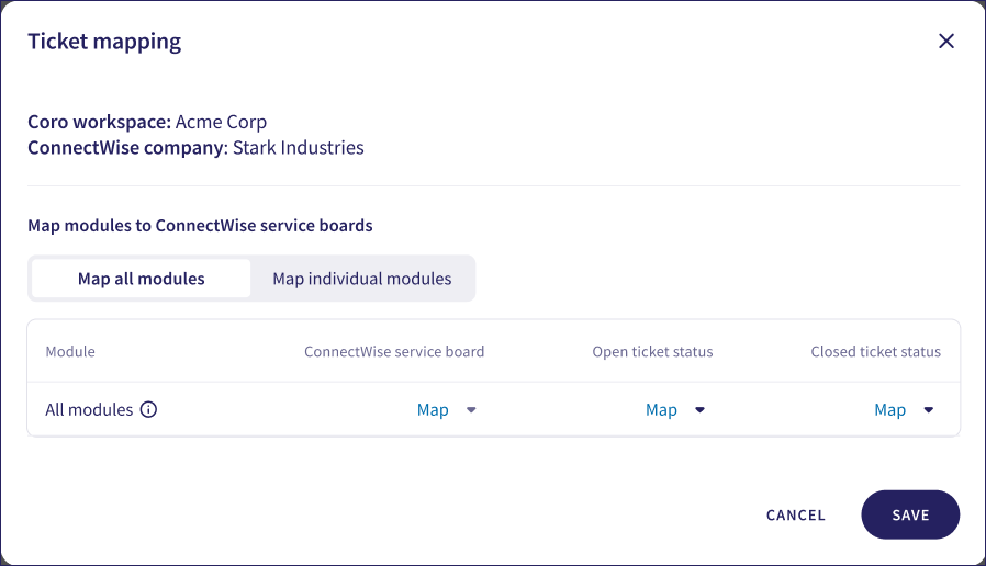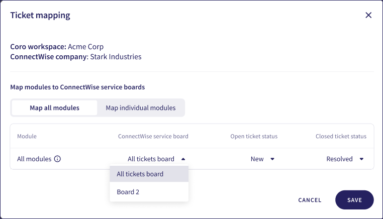 Coro enables you to map all tickets in a workspace to a single ConnectWise Service Board, or to map tickets for individual subscribed modules to separate Service Boards.