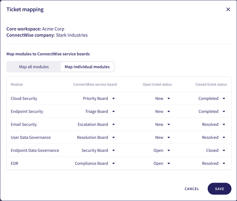 - Open ticket status: For each module, select the Service Board ticket status you want to use to represent open Coro tickets.