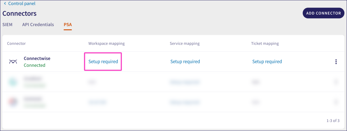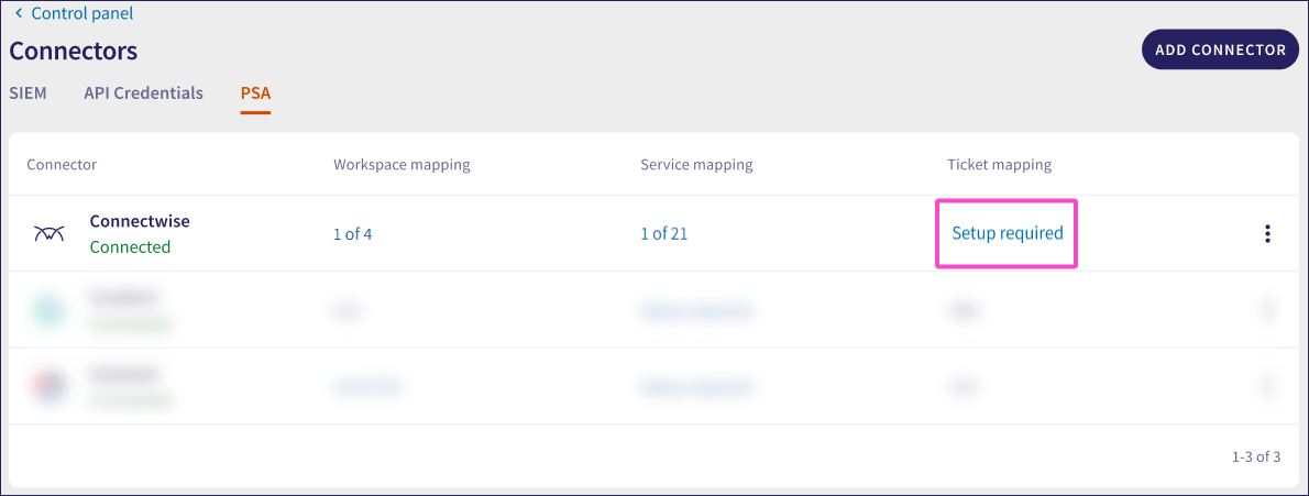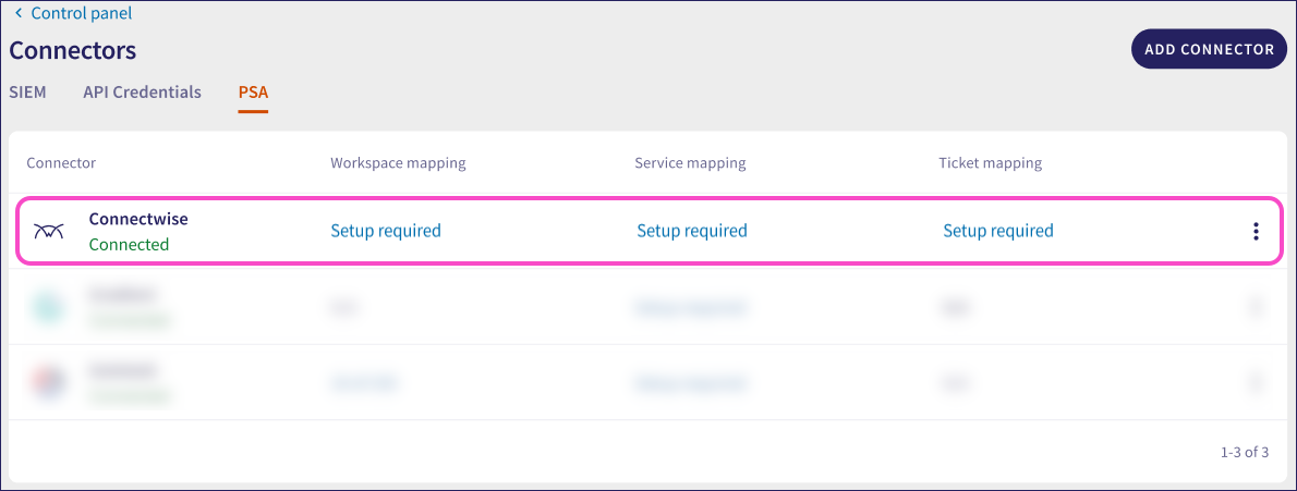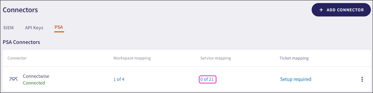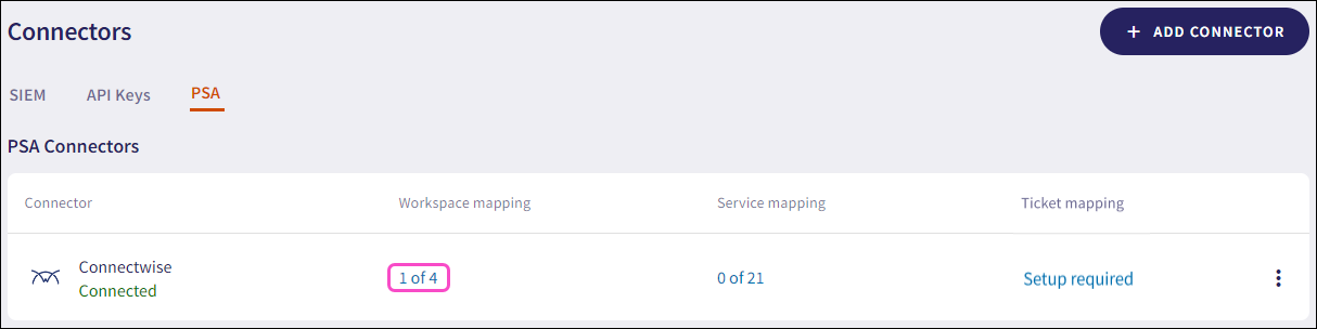 After the ConnectWise connector is created and listed as Connected in the PSA Connectors list, you can map workspaces, services, and ticket logs.