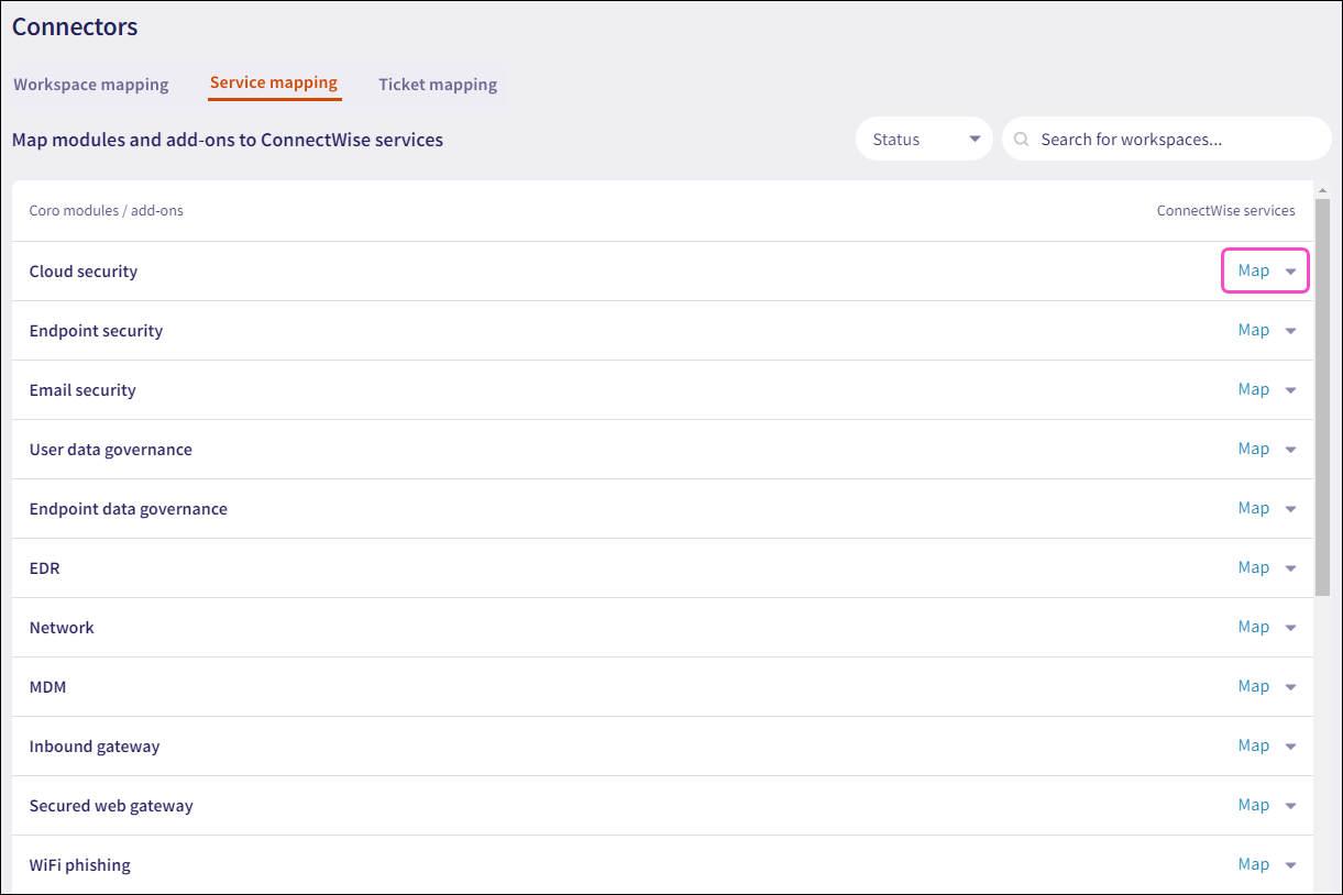 From the ConnectWise Services column of the targeted workspace record, select the Map dropdown:
