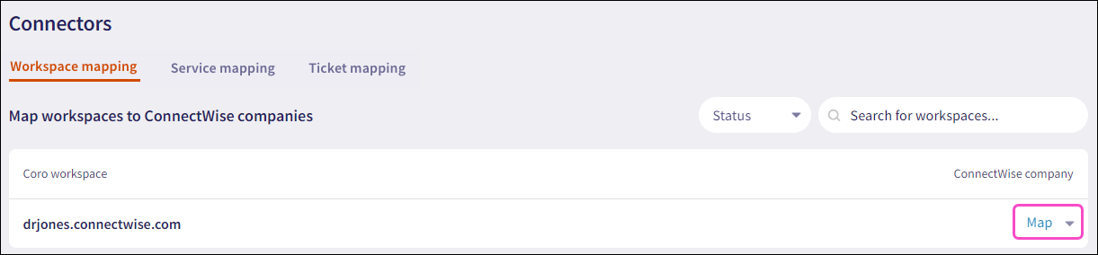From the ConnectWise Company column of the intended workspace record, select the dropdown next to Map: