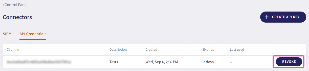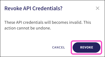 Deleting API credentialsTo delete API credentials:Select REVOKE, adjacent to the set of API credentials:Coro displays the Revoke API Credentials dialog.Select REVOKE:Coro deletes the API credentials and displays a confirmation message: