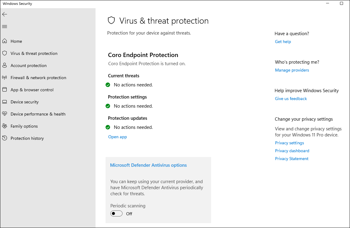 Coro is now the primary antivirus (AV) software for the device and is listed as an authorized Windows Security Center (WSC) provider in the Virus & threat protection section of the Windows Security component: