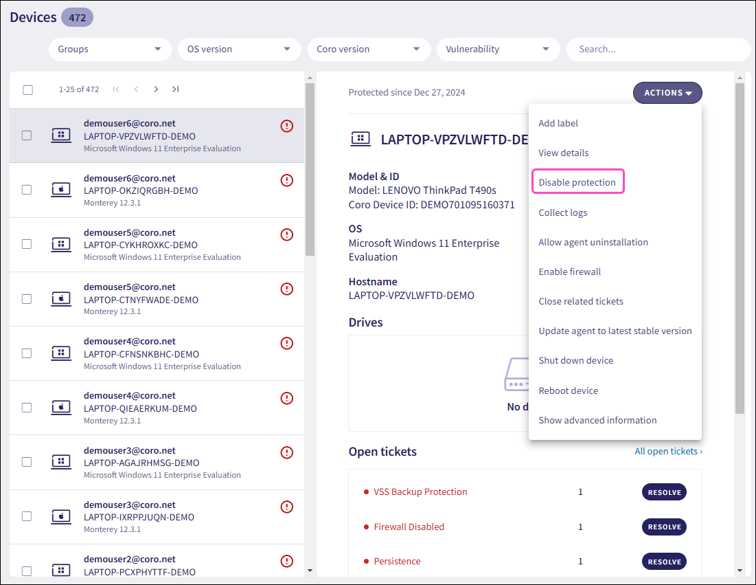 Coro currently supports disabling and re-enabling protection on devices running macOS and Windows agents.