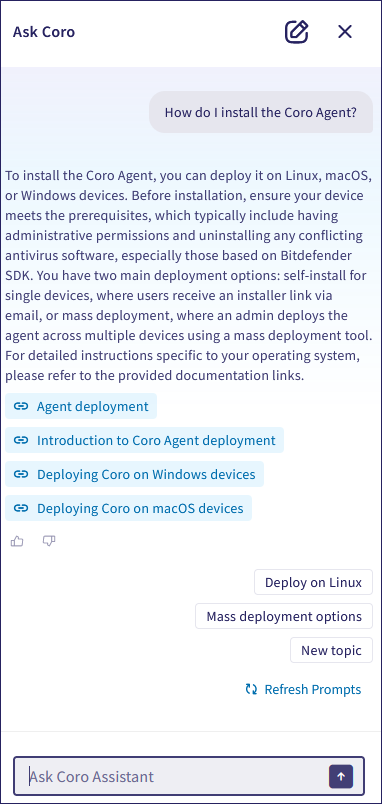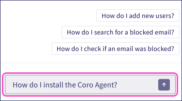Ask Coro answers natural language questions about Coro features, configuration, and troubleshooting, with links to relevant product documentation.