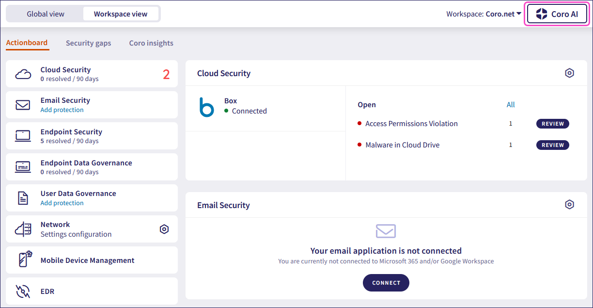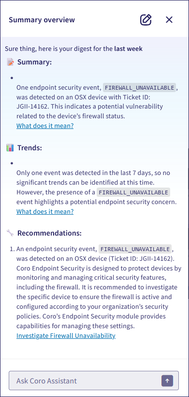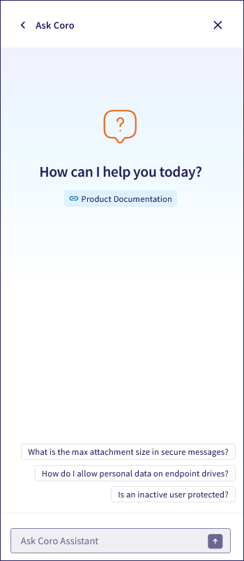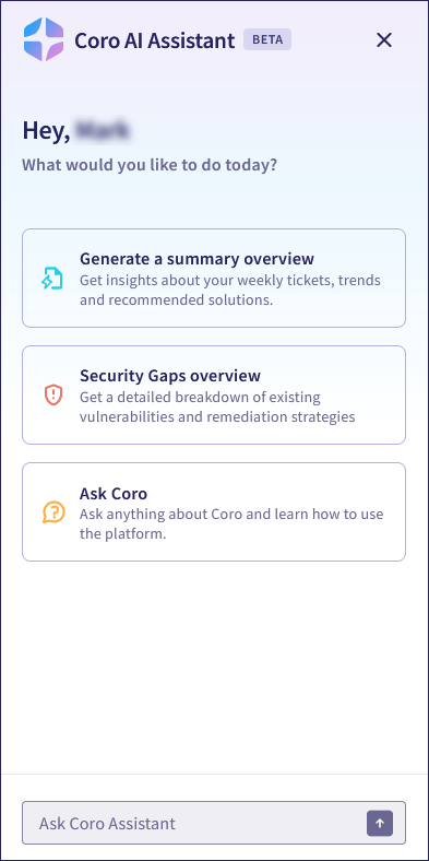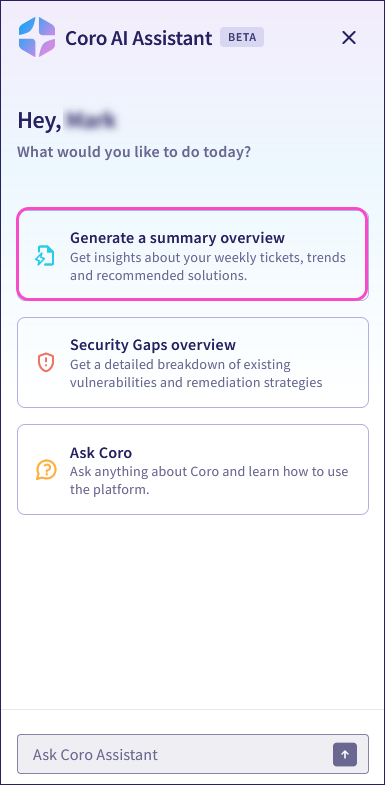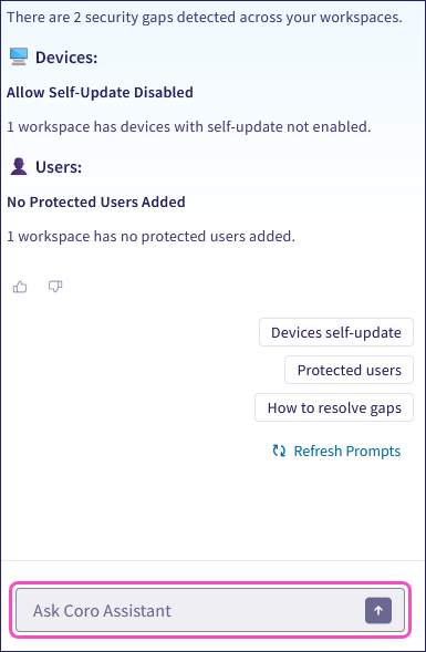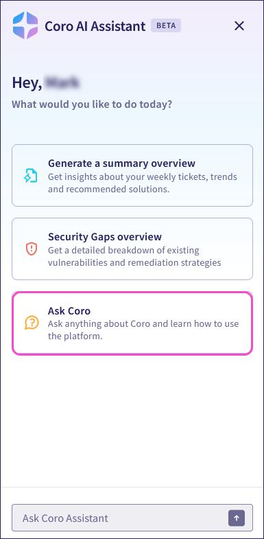 The Coro AI Assistant is an AI-powered workspace tool that helps admin users interpret Coro tickets, review trends, and find information about product functionality directly from the Coro console. It uses Coro product documentation, ticket data, and contextual insights to support investigation and resolution. It also summarizes active security gaps in your workspace and provides remediation recommendations to help strengthen your security posture.