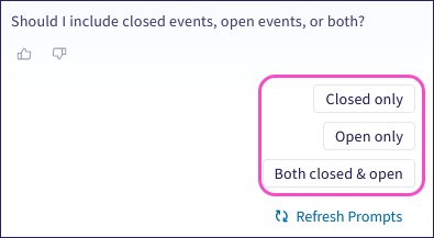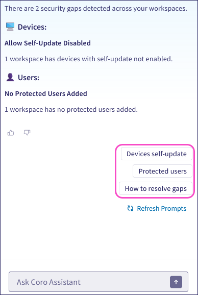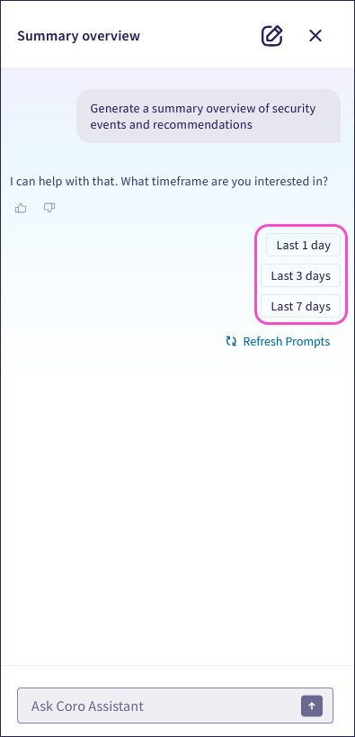 Coro AI Assistant creates suggested queries dynamically. Select Refresh Prompts to update the available prompts based on the previous response: