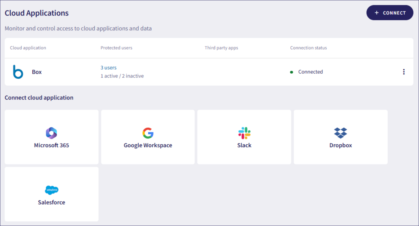 As you connect to cloud applications, use this page to view details for each connection. Coro shows the number of protected users, categorized into active and inactive statuses, the number of connected third-party applications, and the current status of the connection: