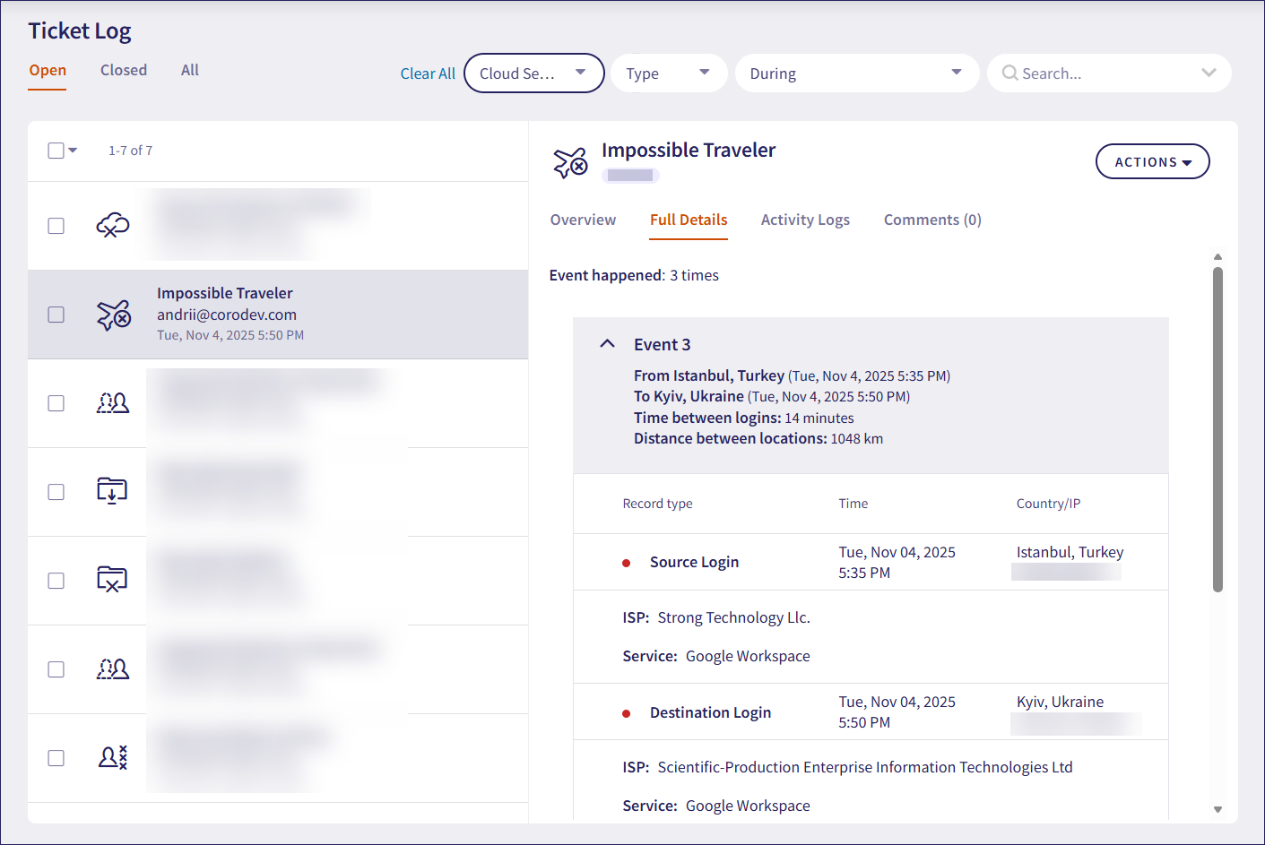 Coro classifies Impossible traveler tickets as open for review, automatically closing them after a review period of 10 days.
