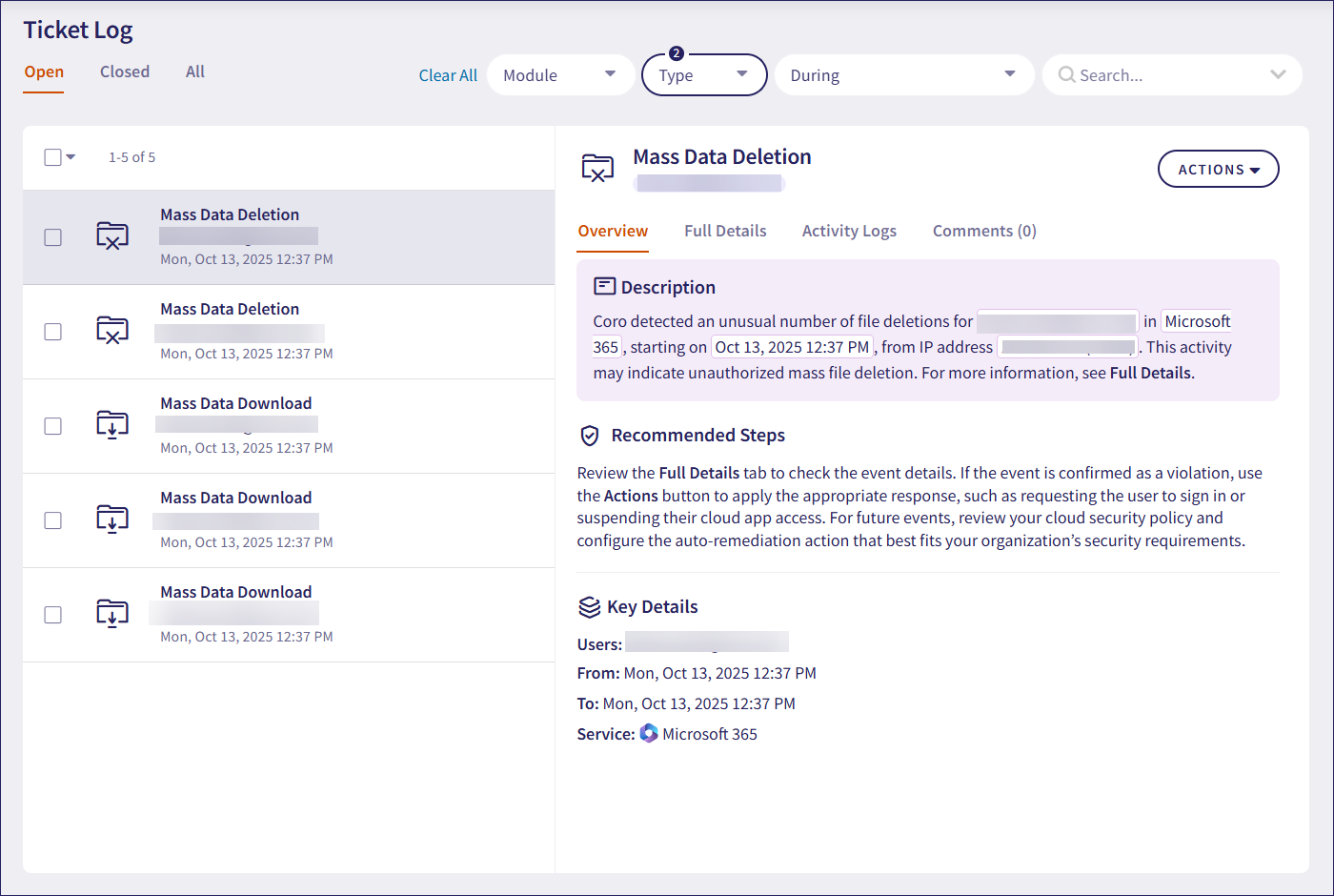 Coro creates these ticket types when it detects abnormally large amounts of data deletion or data download from cloud application accounts of individual users. Coro closes mass event tickets after 14 days.