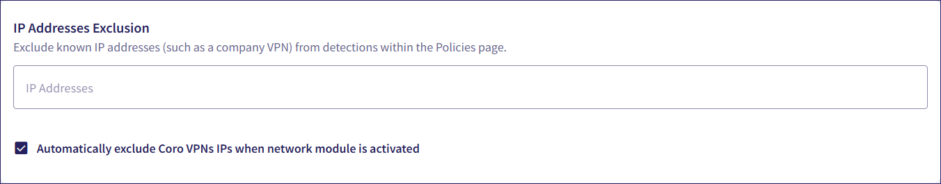 If you use the Coro Network module, enable Automatically exclude Coro VPNs IPs when network module is activated to instruct Coro to automatically exclude Coro's VPN service IP addresses.
