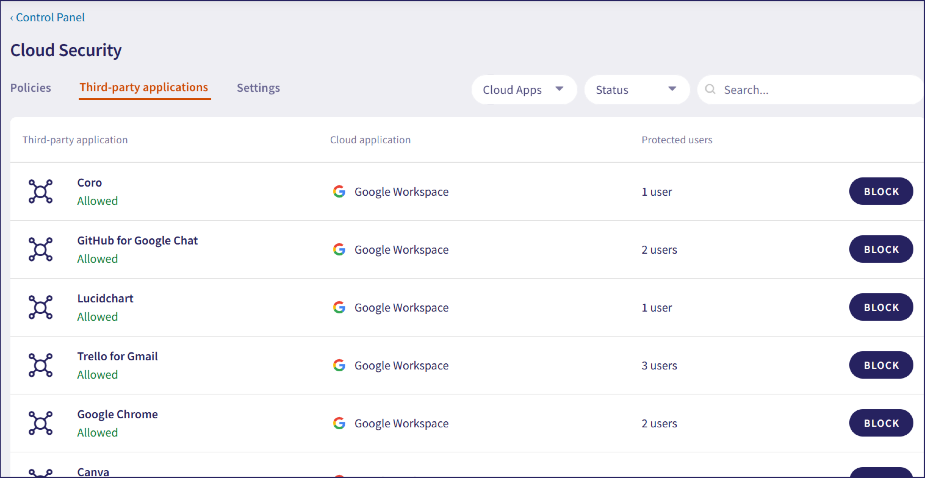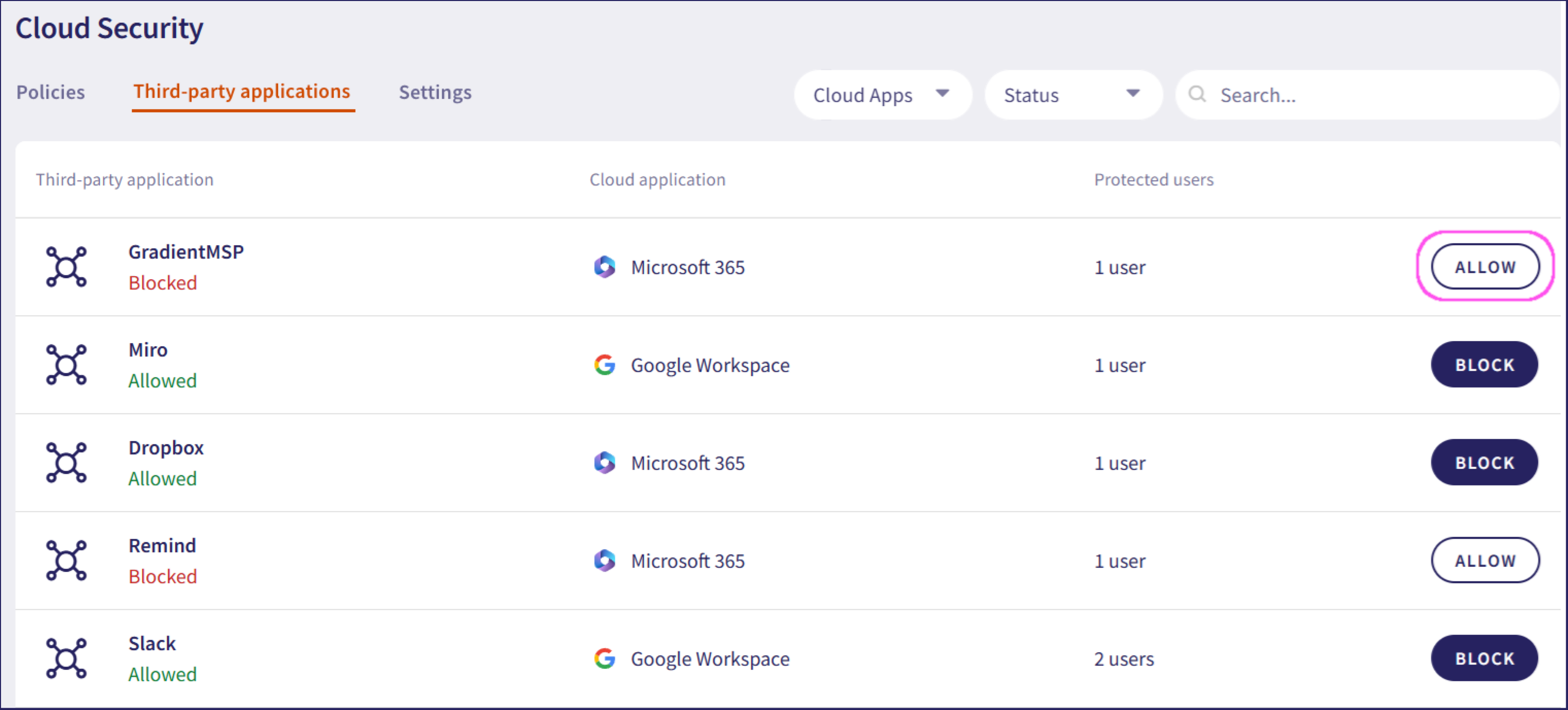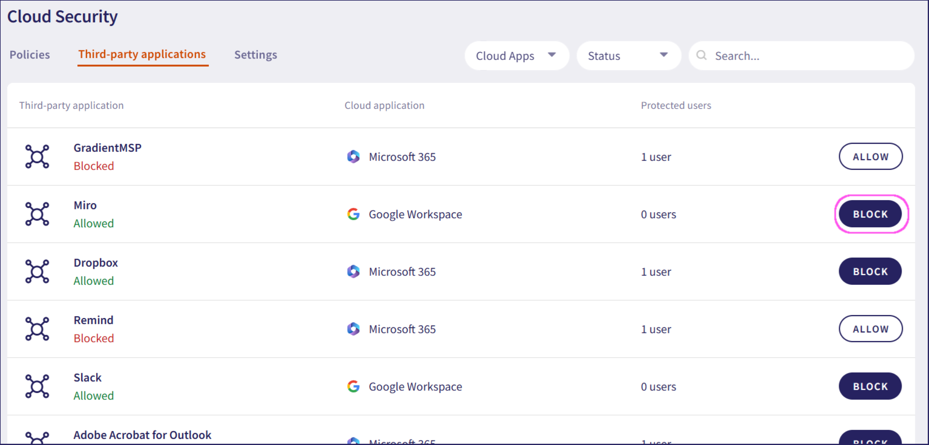 Status: Filters third-party applications by status (blocked/allowed)