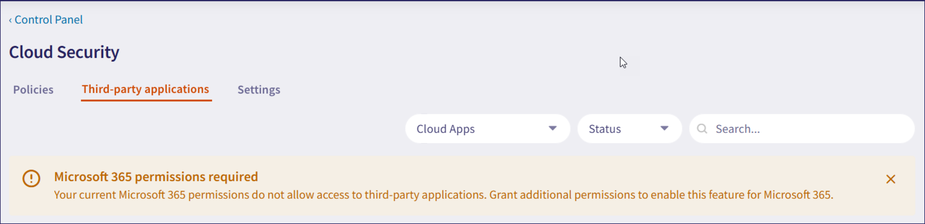 If Coro is unable to access third party applications for a connected cloud application, the Third-party applications tab displays a banner. For example: