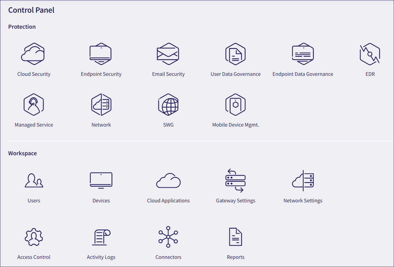 The Control Panel enables you to configure protection settings for your subscribed security modules and add-ons. The Control Panel is also where you administer your workspace, cloud applications, protected users, and their devices.
