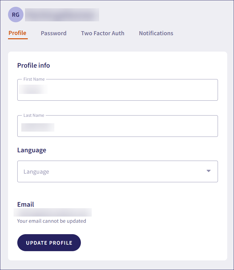 Use this tab to set your first name, last name, and default language for the Coro console. Select Update profile to save your changes.