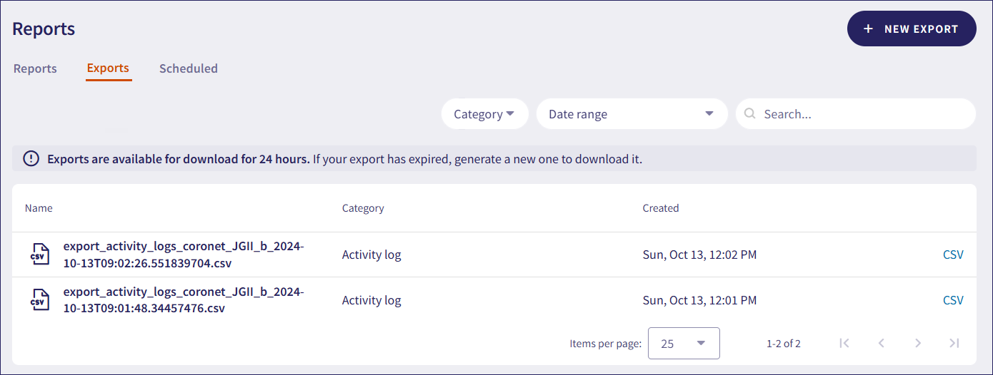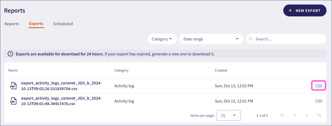 Coro lists exports generated in the past 24 hours. Admin users can download exports by selecting CSV: