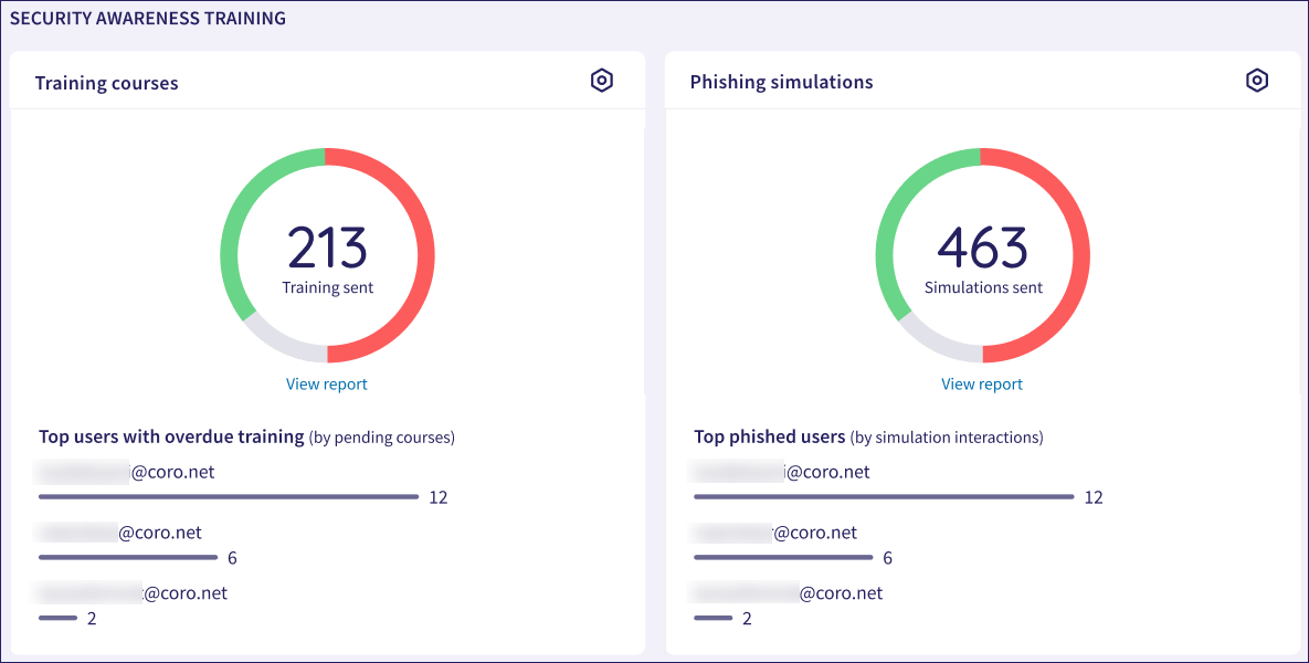 Coro's Security Awareness Training module enables admin users to enroll protected users in a training plan to improve understanding of common security threats. The standard plan comprises phishing simulation emails to test user awareness and targeted training courses to educate users on best-practice cyber awareness and security advice.