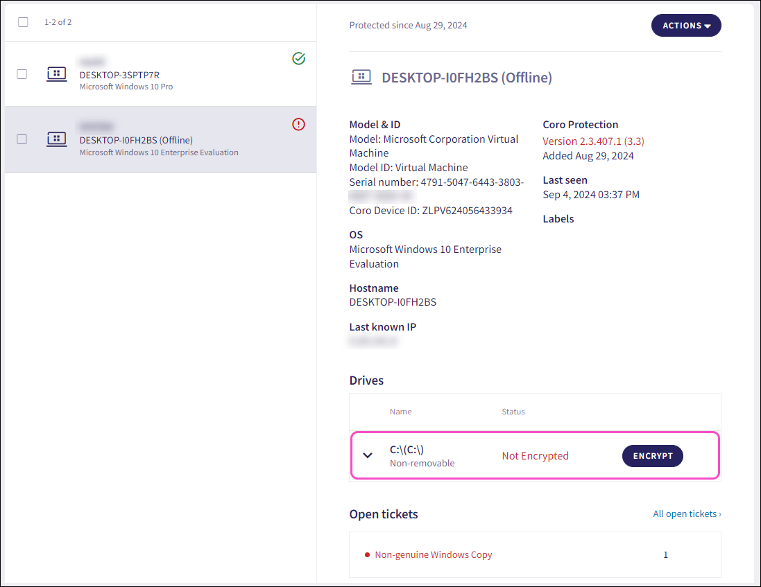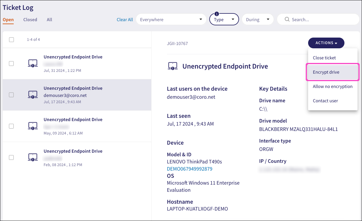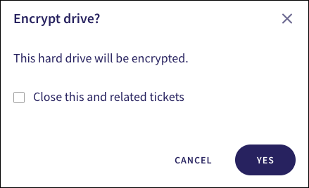 From the left pane, select the ticket referencing the drive you want to encrypt. Then, from the right pane, select ACTIONS > Encrypt drive: