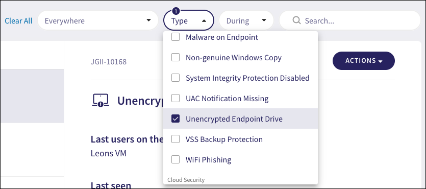 In the Type dropdown, select Unencrypted Endpoint Drive from the Endpoint Security section to show only those tickets indicating unencrypted drives: