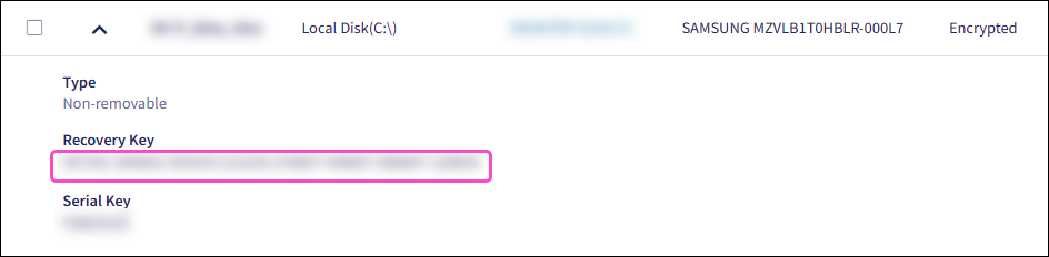 After encryption is complete, expand a drive’s record to view its recovery key.