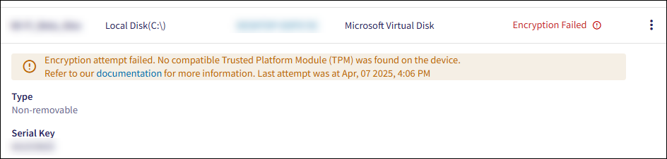 When an encryption attempt fails, Coro displays a detailed reason and provides a link to the Coro product documentation for further troubleshooting: