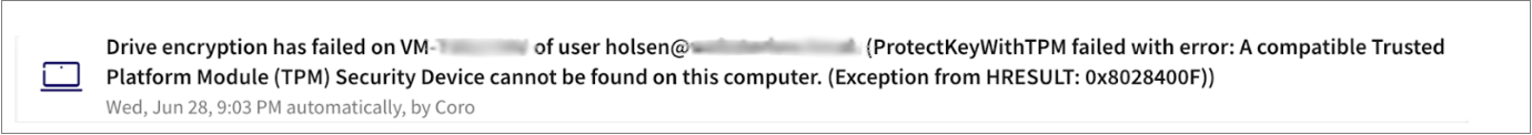 If your device does not have TPM enabled, the following message appears in the Coro Activity Log: