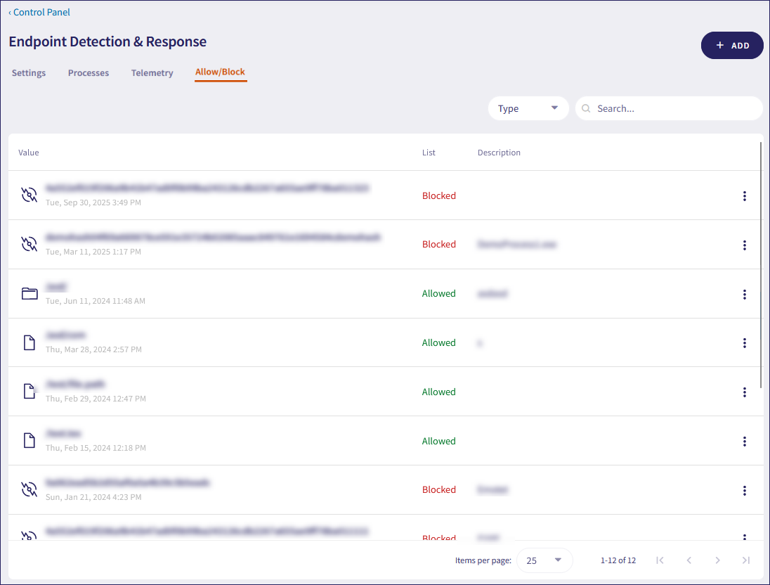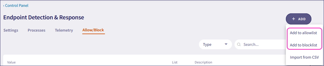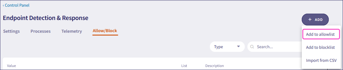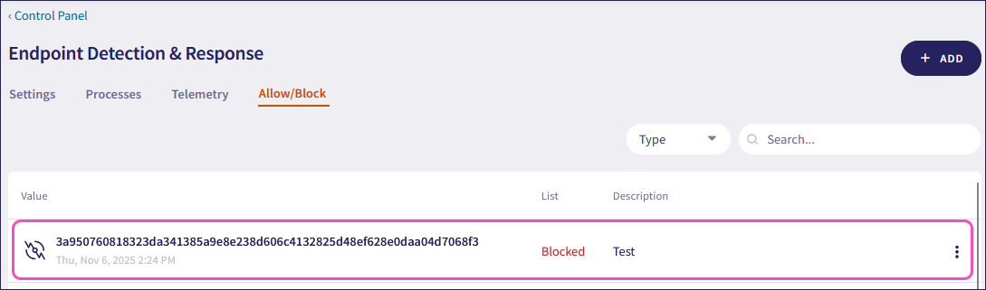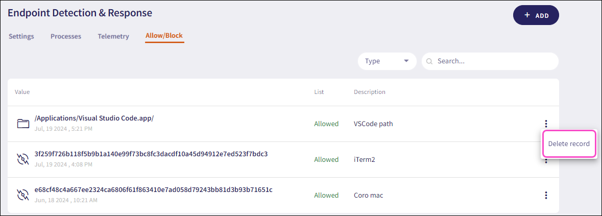 Filter and search the EDR allowlist and blocklist to find specific entries. The Type filter enables you to filter allowlist and blocklist records by: