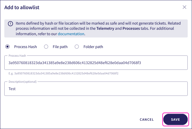 Select Process Hash, File path or Folder path, then enter a valid SHA-256 hash or process file or folder path.