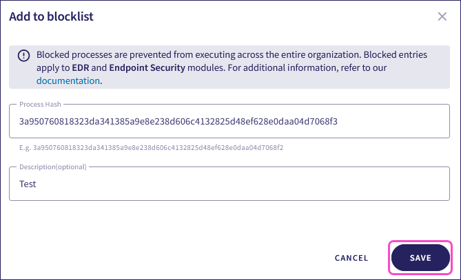 | Process | Prevents EDR tickets from triggering for the specified process file hash. Related process information is not collected in the EDR Telemetry and Process tabs. | Blocks unsafe process execution. | N/A | Blocks unsafe process execution. |