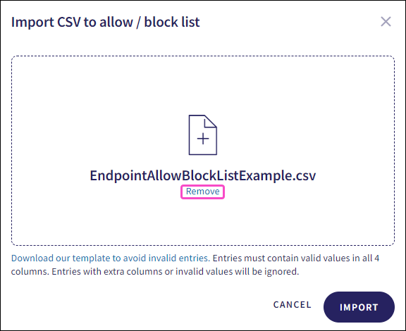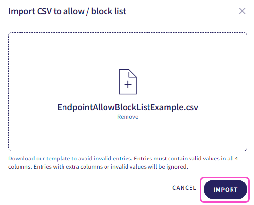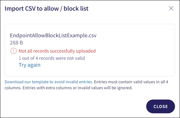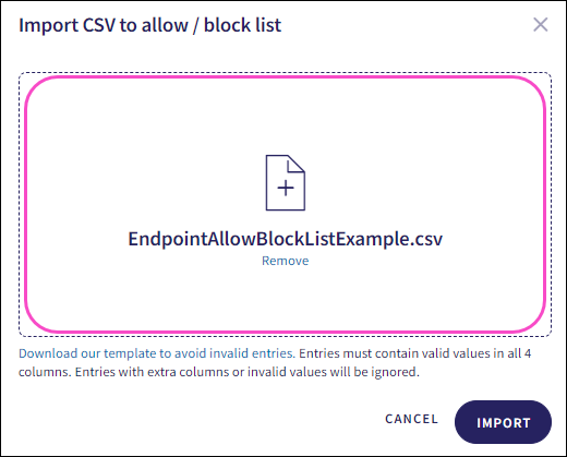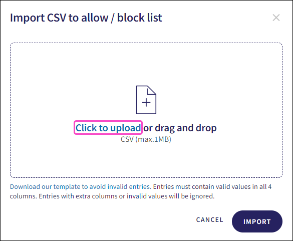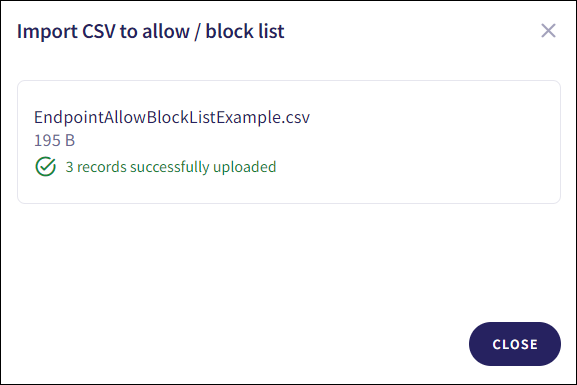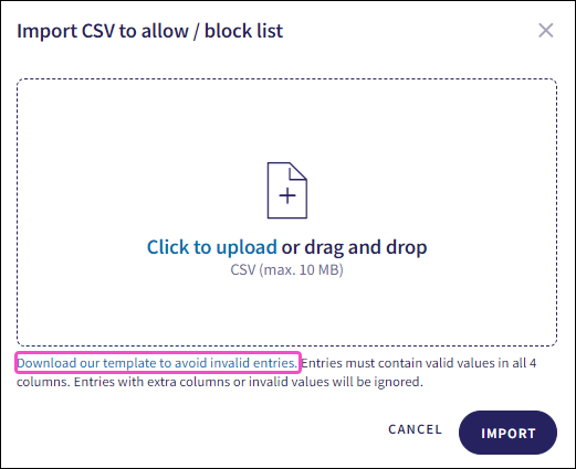 Admin users can add records to the allowlist or blocklist by importing a CSV file containing a list of records.
