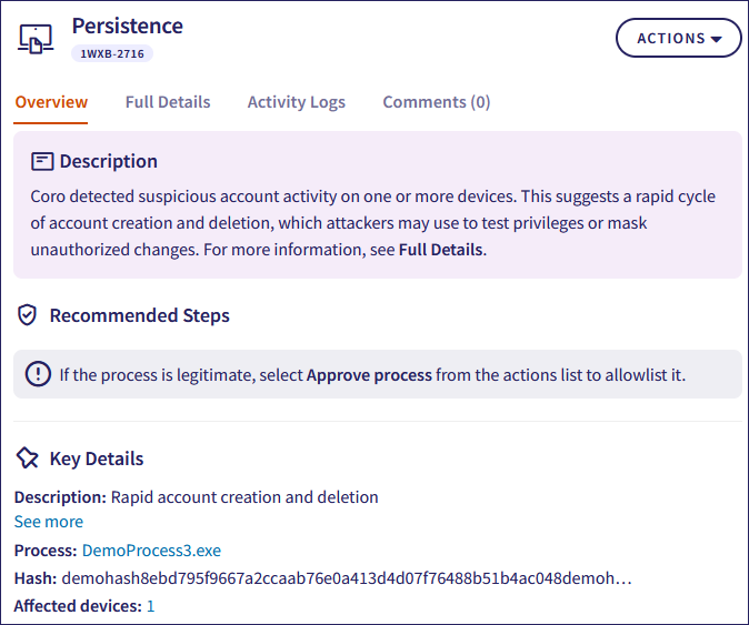 | Block process | Blocks process execution. Coro adds an entry to the EDR and Endpoint Security blocked list. For more information, see Endpoint Security Allow/Block lists, EDR allowlist and blocklist, and EDR Processes. |
