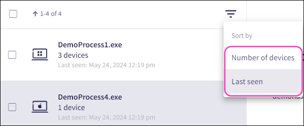 Select the devices counter to view the Devices page, filtered by the process hash value: