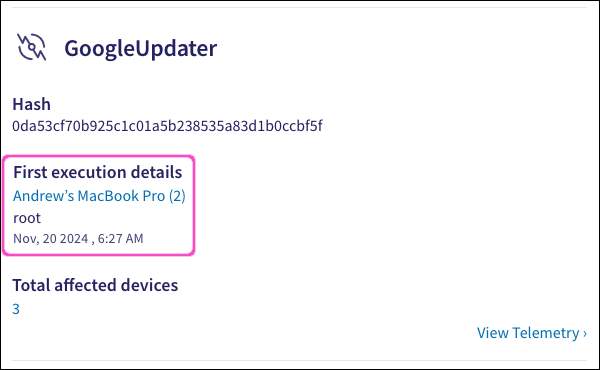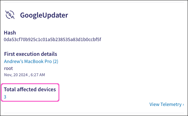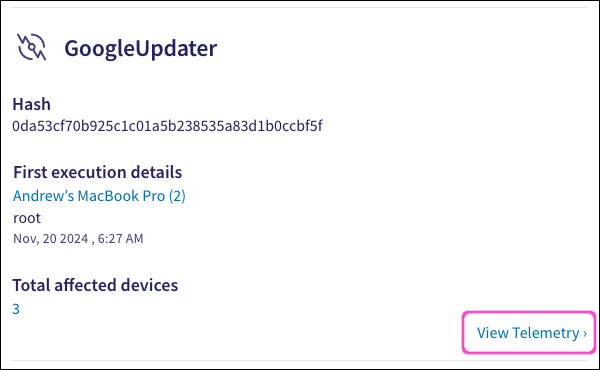 Select View Telemetry to display the Telemetry page, filtered by the process hash value: