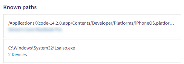 Known paths: All directory paths from which the process was executed. Each directory path includes the hostnames (devices) affected.