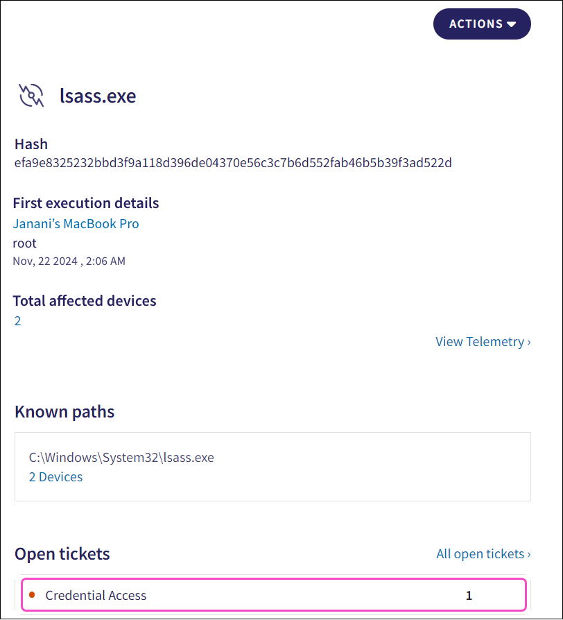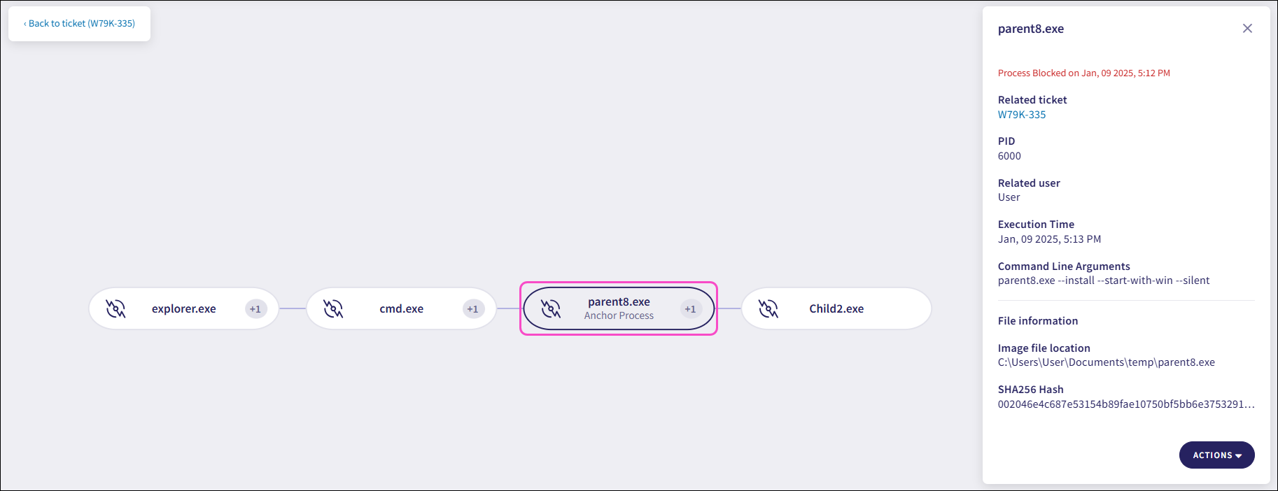 Process: The executable file that triggered the EDR ticket. Select the process to open the Processes page filtered by hash.