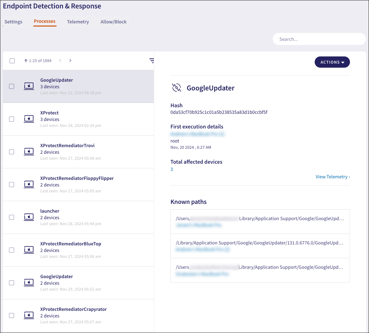 The EDR Processes page compiles information on device processes executed within the organization. This centralized aggregation enables quick analysis and detailed investigation of specific processes, giving admin users with sufficient permissions visibility into potential security threats.
